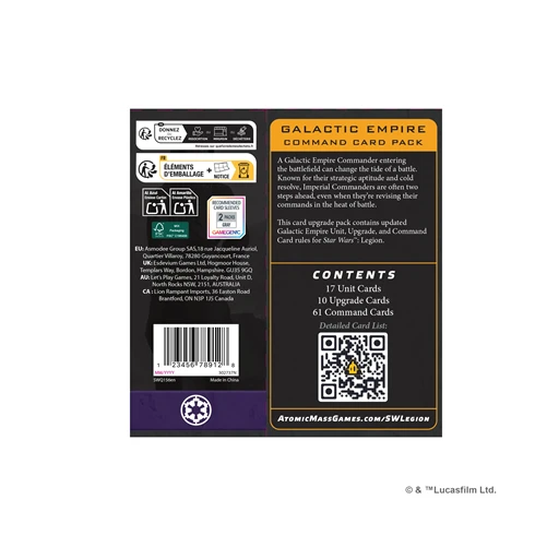 This card upgrade pack contains 88 updated Galactic Empire Unit, Upgrade and Command Card rules for Star Wars: Legion. It should be offered as an upgrade path to players to update their Galactic Empire Unit, Upgrade, and Command cards to the new visual style and rules with an official product instead of using print and play materials.