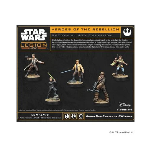 The Rebellion is built on the deeds of its legendary heroes, inspiring all to rise up to fight the Empire. Recruit Luke Skywalker as Commander of the Rebellion or famed Jedi Knight, General Han Solo, General Leia Organa, and Chewbacca to help defeat the Empire and bring freedom and peace back to the galaxy! This Star Wars: Legion expansion contains Jedi Knight Luke Skywalker, General Han Solo, General Leia Organa, Chewbacca, and Commander Luke. These miniatures are now produced in a hard plastic, giving them more detail.
