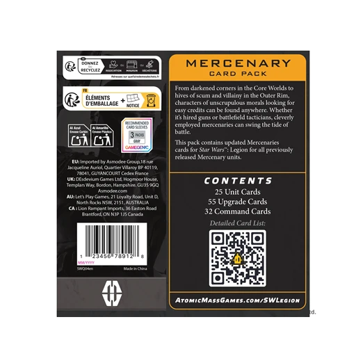 UNLEASH MERCENARY POWER: The Mercenary Card Pack enhances your Star Wars: Legion game with updated Unit, Command, and Unit-specific Upgrade cards for previously released mercenary units.
