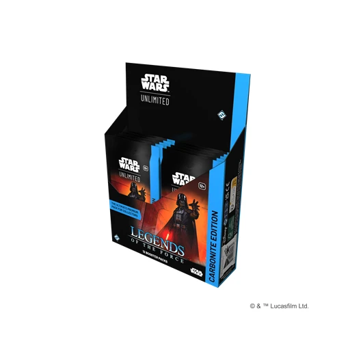 In this Carbonite booster pack display for the game’s fifth set, Legends of the Force, you’ll find 12 individually wrapped Carbonite booster packs. Each pack contains approximately: 1 Hyperspace/Showcase leader card, 6 premium foil cards, 1 foil rare or legendary card, 1 Carbonite-exclusive Prestige card, 4 Hyperspace cards, 1 Hyperspace rare or legendary card, and 2 Hyperspace foil cards. The Legends of the Force set features characters and content from multiple eras in the Star Wars galaxy, with a particular focus on Force users, such as Jedi, Sith, and more.